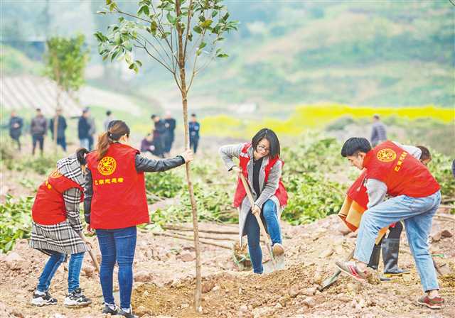 3月12日,巴南區(qū)機(jī)關(guān)干部、企事業(yè)單位人員、志愿者等400余人進(jìn)行了義務(wù)植樹。據(jù)悉,巴南區(qū)春季義務(wù)植樹將達(dá)到10萬株,全年造林15.7萬畝。記者 齊嵐森 攝