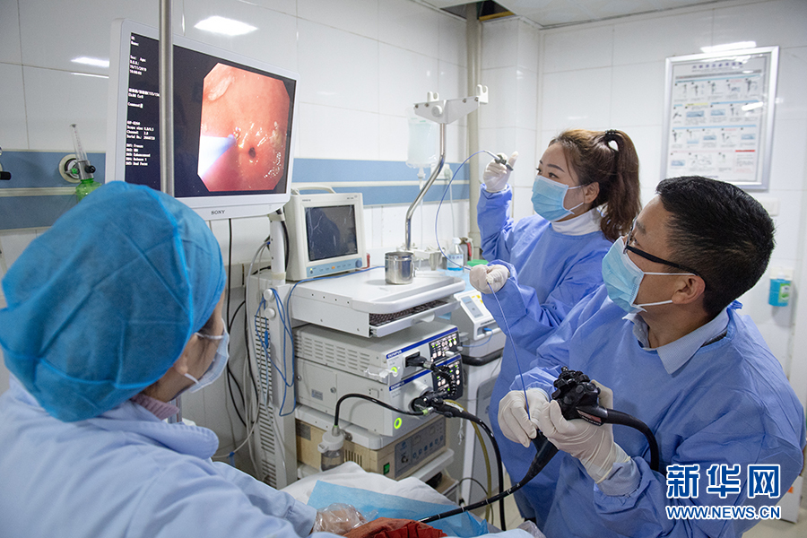 基層醫(yī)療水平的提升,是破解因病致貧的關(guān)鍵。在城口縣人民醫(yī)院,大來自山東臨沂的王愛華(右一),正帶領該院醫(yī)生為病人做胃鏡檢查。得益于東西扶貧協(xié)作,包括王愛華在內(nèi)的21名支援醫(yī)生,從山東臨沂來到重慶城口,提升了當?shù)氐尼t(yī)療水平,緩解當?shù)乜床‰y、看病遠、看病貴的難題。新華網(wǎng) 李相博 攝