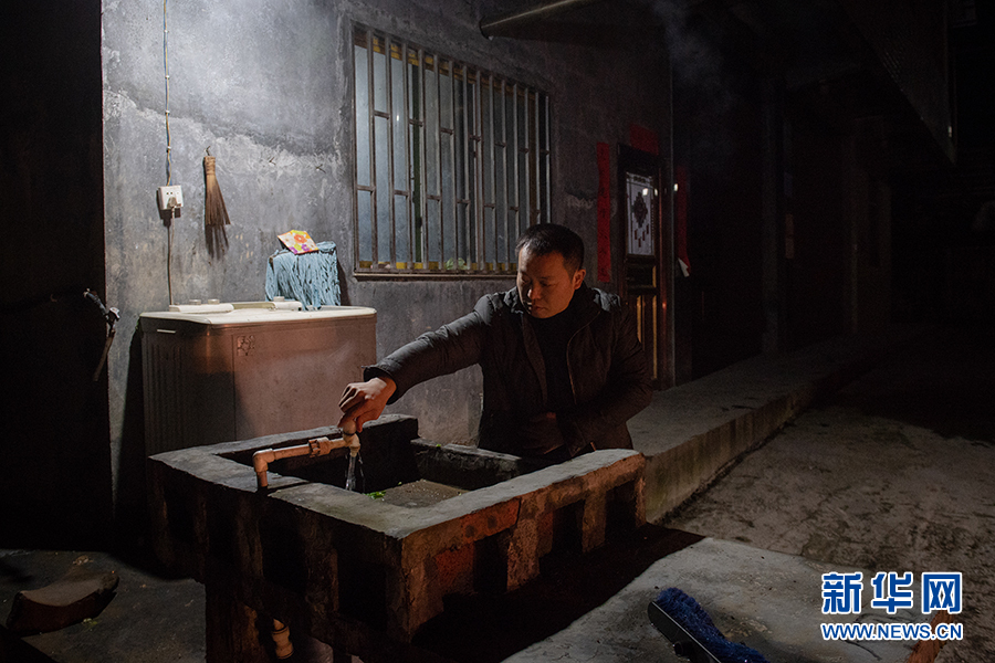 飲水安全關(guān)系著村民的生產(chǎn)生活,冬季冰雪天氣,常常對高海拔地區(qū)村民用水造成影響。寒冬夜里,酉陽車田鄉(xiāng)車田村的駐村“第一書記”彭明涌,前往村戶家中,查看飲用水管道是否流暢。新華網(wǎng) 李相博 攝