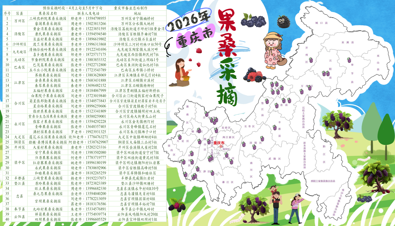 春桑垂蜜果,甜韻滿山城。4月上旬至5月中下旬,重慶迎來(lái)春季果桑采摘黃金期。在重慶市商務(wù)委指導(dǎo)下,市蠶業(yè)總站整合全市果桑田園信息,正式發(fā)布全市18個(gè)區(qū)縣40個(gè)果桑園采摘指南,方便市民前往進(jìn)行采摘。