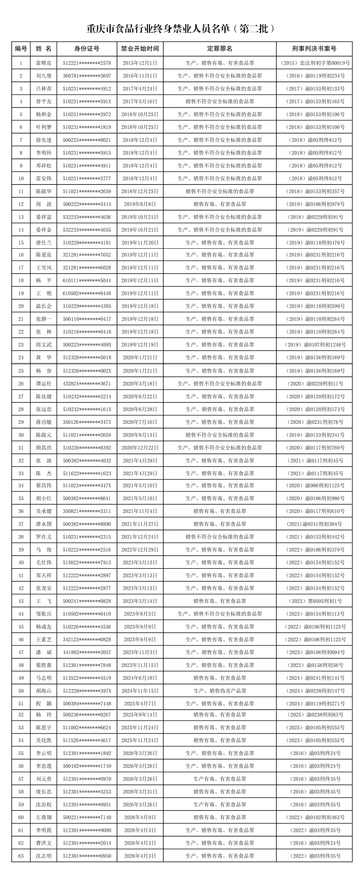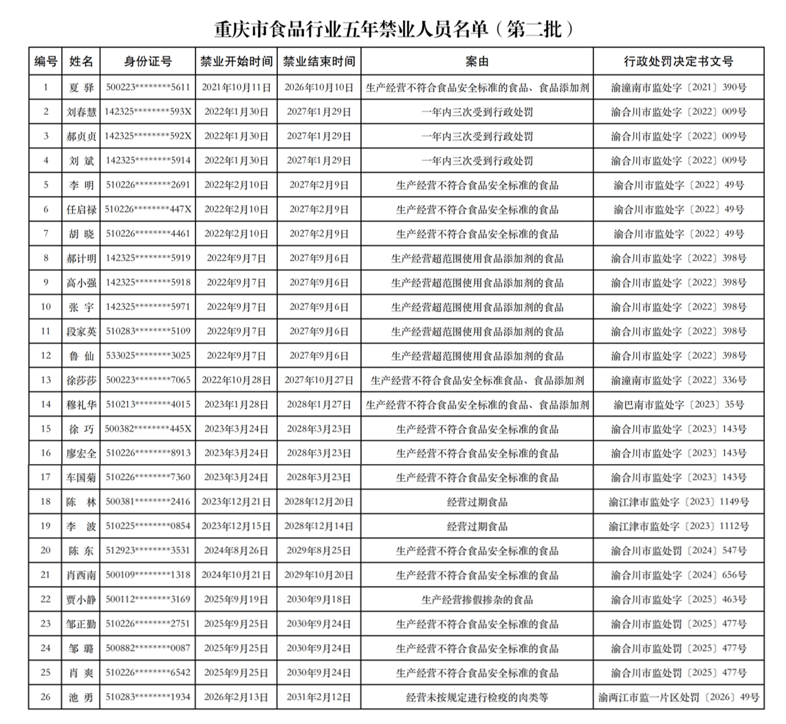 重慶市食品行業(yè)五年禁業(yè)人員名單(第二批)(央廣網(wǎng)發(fā) 重慶市市場監(jiān)督管理局供圖)