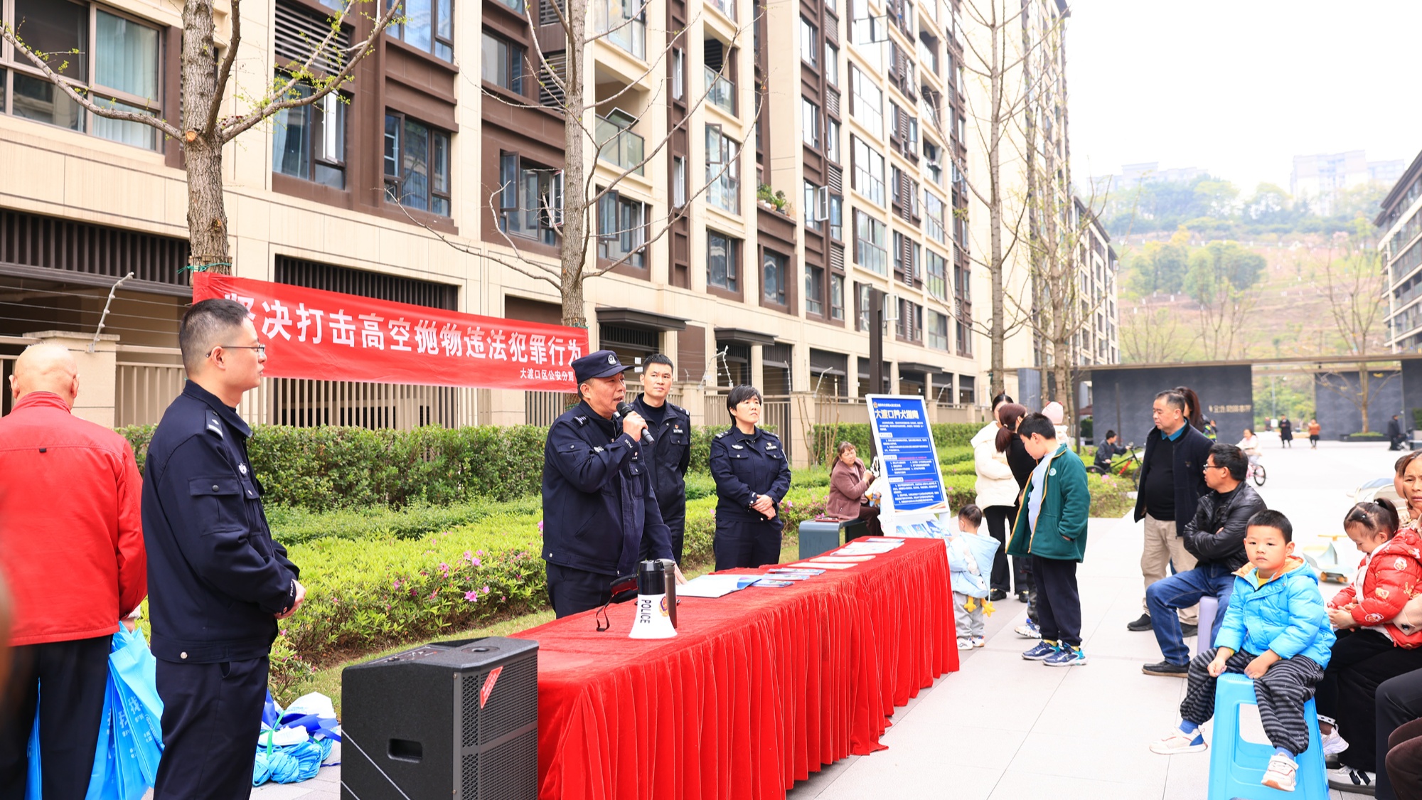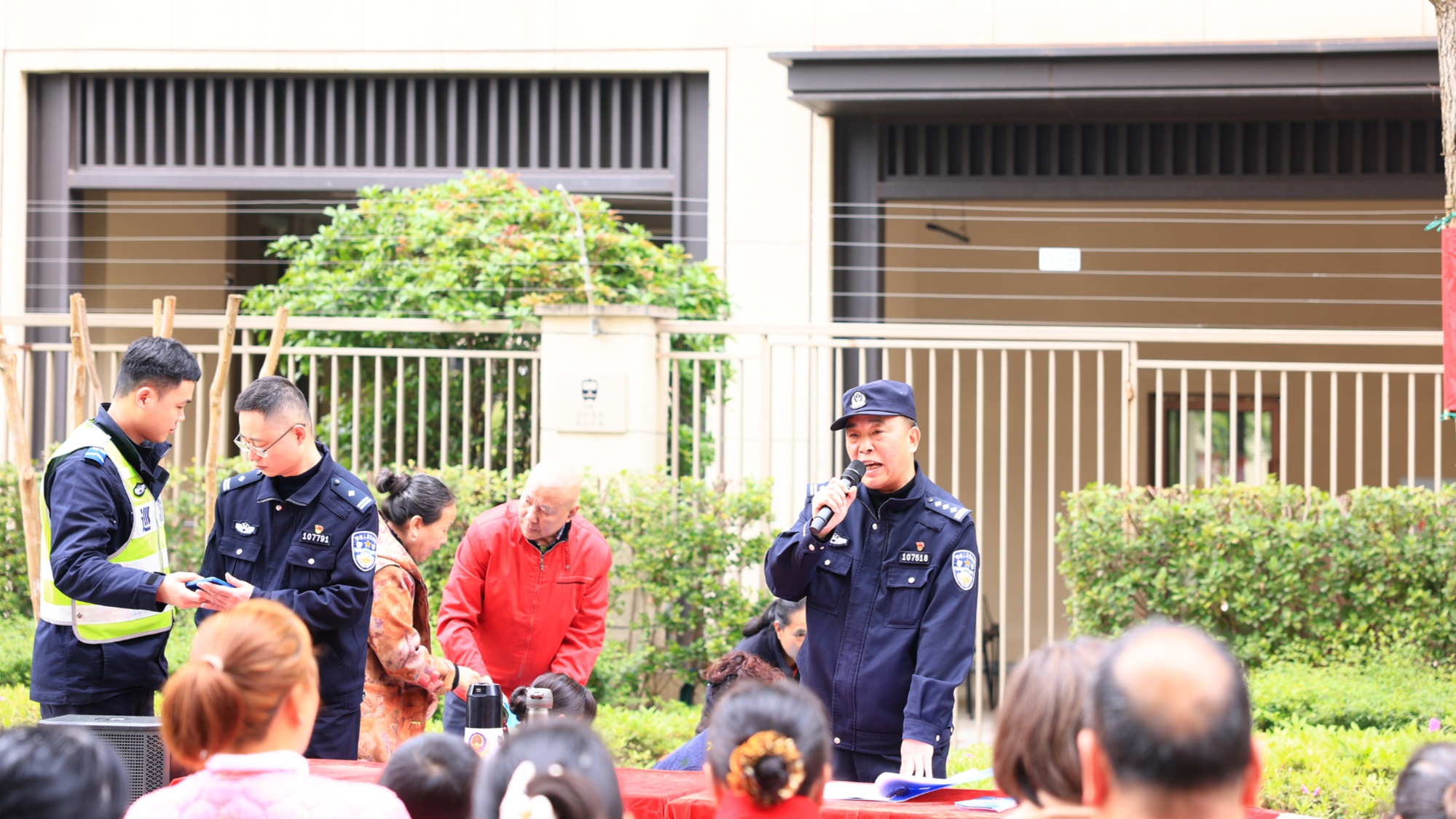 上午9點(diǎn)半,格林春岸小區(qū)院壩內(nèi),居民圍坐在一起聆聽民警宣講。民警鄧雁冰通報(bào)轄區(qū)刑事治安情況,現(xiàn)場收集電動(dòng)車充電安全、高空拋物、文明養(yǎng)犬等意見,并發(fā)放安全手冊(cè),講解相關(guān)法律規(guī)定。