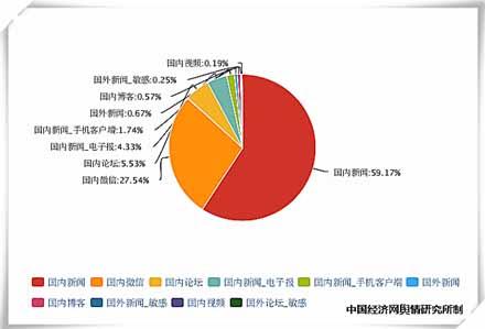 中國經(jīng)濟(jì)網(wǎng)輿情研究所監(jiān)測數(shù)據(jù)顯示,2015年1月1日至12月25日共監(jiān)測到相關(guān)新聞報道13716條,博客129篇,論壇1052條,微博24014條,微信6936條。從該事件的網(wǎng)絡(luò)輿情占比圖可以看出,新聞媒體,以及微信、微博等自媒體對其討論較多,而博客和論壇的相關(guān)討論較少。