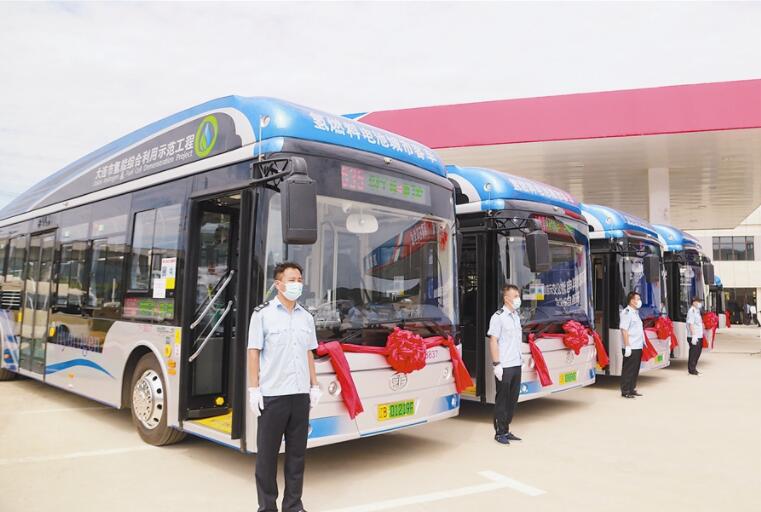 大連市氫燃料電池公交示范線路開通啟動(dòng)儀式在英歌石加氫站舉行。 大連新聞傳媒集團(tuán)記者王華 攝