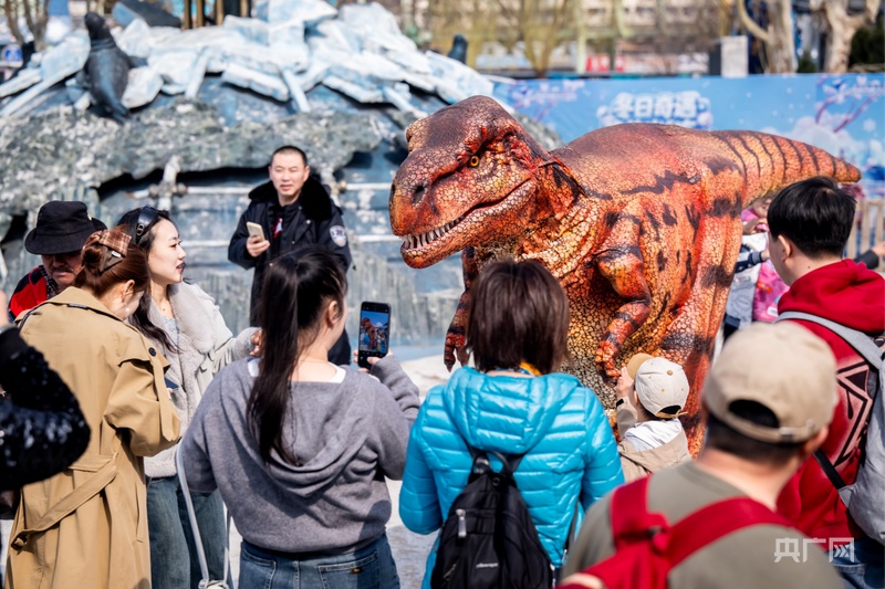 游客在園內(nèi)與恐龍互動(央廣網(wǎng)發(fā) 大連老虎灘海洋公園供圖)