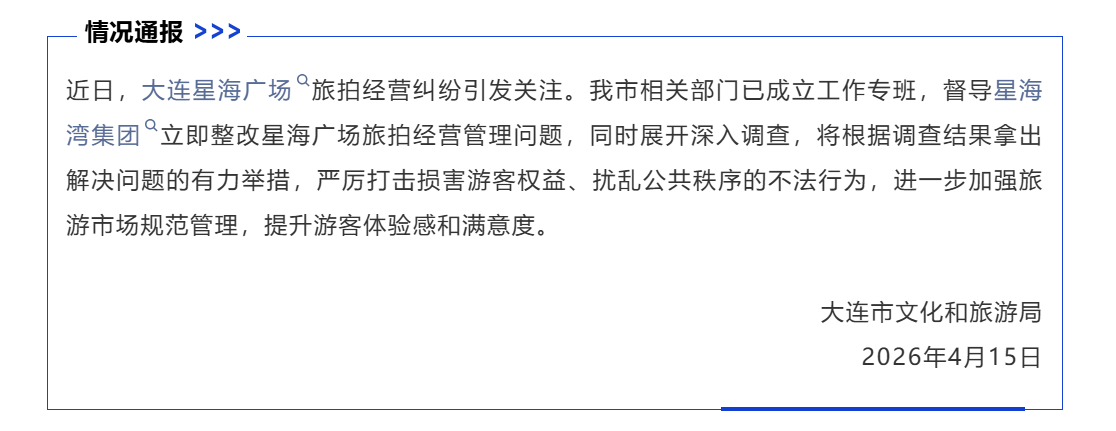 央廣網(wǎng)大連4月15日消息(記者易博聞)近日,大連星海廣場(chǎng)旅拍經(jīng)營糾紛引發(fā)關(guān)注。大連市文化和旅游局4月15日發(fā)布通報(bào)稱,大連市相關(guān)部門已成立工作專班,督導(dǎo)星海灣集團(tuán)立即整改星海廣場(chǎng)旅拍經(jīng)營管理問題,同時(shí)展開深入調(diào)查,將根據(jù)調(diào)查結(jié)果拿出解決問題的有力舉措,嚴(yán)厲打擊損害游客權(quán)益、擾亂公共秩序的不法行為,進(jìn)一步加強(qiáng)旅游市場(chǎng)規(guī)范管理,提升游客體驗(yàn)感和滿意度。