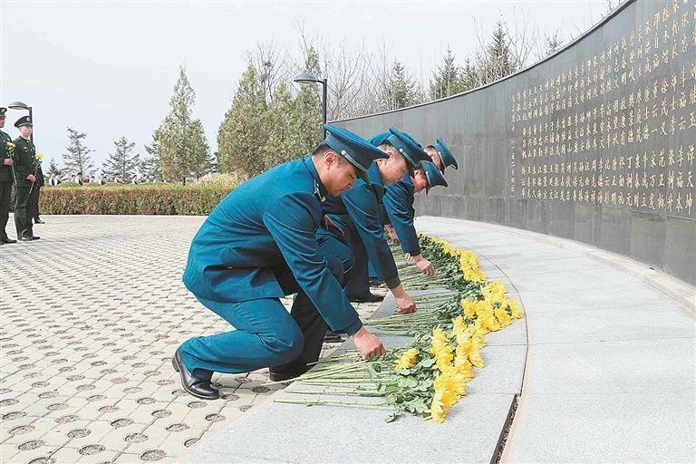 部隊官兵在金普新區(qū)烈士陵園烈士英名墻前獻花。(受訪單位供圖)