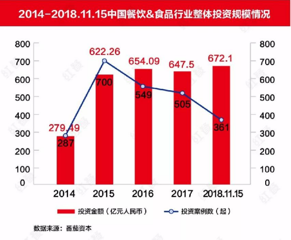 番茄資本剛剛發(fā)布的《2018年中國(guó)餐飲及餐飲供應(yīng)鏈投融資報(bào)告》顯示,截至2018年11月中旬,行業(yè)披露的投資案例數(shù)大幅下滑至361起,獲得投資的餐飲項(xiàng)目數(shù)量越來(lái)越少。
