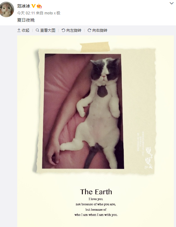 范冰冰半夜曬李晨“裸睡”照 活生生人不如喵