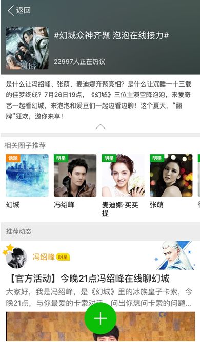 《幻城》自7月24日開播以來就備受關(guān)注,就在劇情展開地如火如荼之際,作為互聯(lián)網(wǎng)播出平臺之一的愛奇藝進(jìn)行了新一輪的演員、粉絲之間的互動。在愛奇藝的泡泡專區(qū),演員馮紹峰、張萌、麥迪娜在泡泡內(nèi)與《幻城》的粉絲們實(shí)時對聊,精彩紛呈。