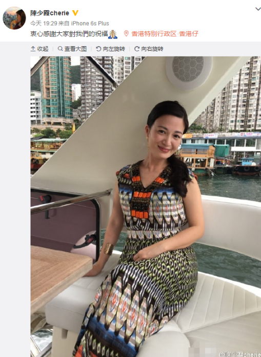 雖然陳少霞之前婚姻失敗,還有兩個女兒,不過如今她再找到真命天子,得到大家祝福的她,都難掩新婚喜悅,還在微博多謝大家祝福。照片中,她坐在游艇上,成了幸福少奶奶模樣,真是好令人羨慕。