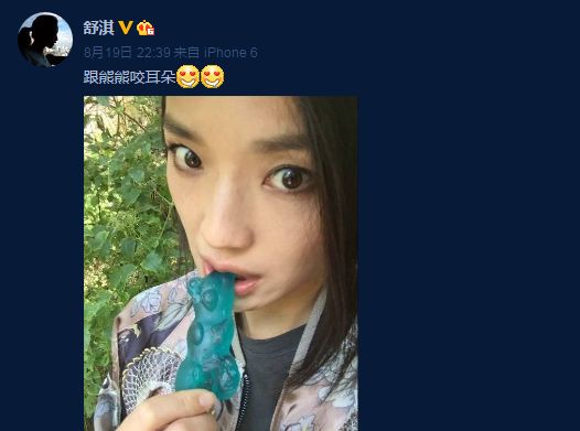 19日晚,舒淇在微博曬出一張自拍并附文:“跟熊熊咬耳朵!闭掌,舒淇并非真的咬熊耳朵,而是在吃一顆軟糖!