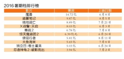 今年暑期檔,票房排在前6位的影片票房均過6億元,但破10億元的電影僅有一部《魔獸》,最終票房難以和去年的冠軍匹敵。眾多業(yè)內(nèi)人士都表示,今年暑期檔缺乏“爆款”的現(xiàn)象級(jí)電影。