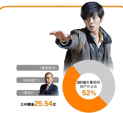 8月31日,2016年暑期檔正式收官,官方數(shù)據(jù)顯示總票房為125億,同比去年的124.31億略有增長,其中6月為39.01億,7月為45.15億,8月約為40億。89部國產(chǎn)片則集體啞火,根據(jù)藝恩智庫數(shù)據(jù),國產(chǎn)片最高票房為《盜墓筆記》的9.87億,其次則是《絕地逃亡》的8.89億。