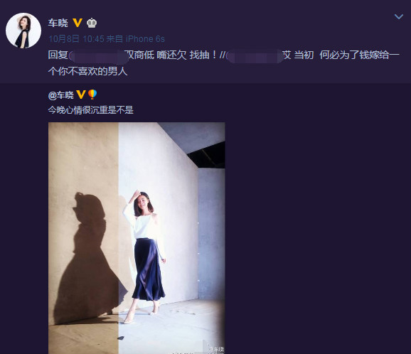 10月9日,車曉因被網(wǎng)友諷刺豪門夢(mèng)碎,發(fā)狠話怒斥網(wǎng)友。她轉(zhuǎn)發(fā)網(wǎng)友的評(píng)論“哎,當(dāng)初,何必為了錢嫁給一個(gè)你不喜歡的男人”,怒斥網(wǎng)友:“雙商低,嘴還欠,找抽