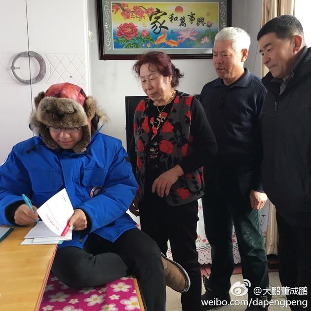 12月5日,大鵬曬坐在炕上為鄉(xiāng)親們簽名的照片,并稱:“見面會!”照片中,大鵬身穿藍色上衣,頭戴雷鋒帽,盤腿坐在炕上簽名,頗具村干部風范。