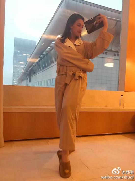 照片中,舒淇穿著一身疑似睡衣的卡其色連體褲,搭配黑色手包,正擺出拍攝平面硬照的高難度姿勢(shì),妝容完整的她最惹人注目的造型配件卻是腳下的一雙棉拖鞋。