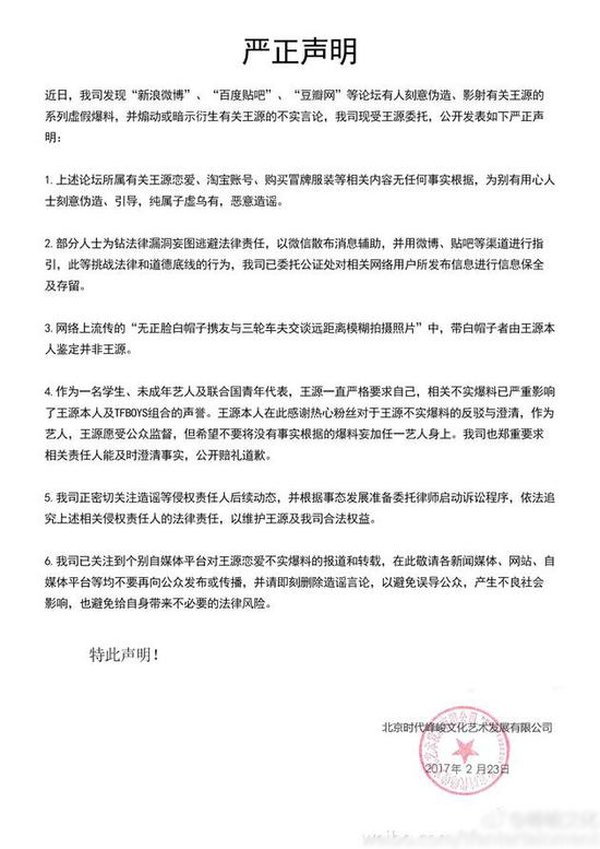2月23日,TFBOYS成員王源所屬經(jīng)紀(jì)公司峰峻文化,發(fā)布了關(guān)于王源戀愛、淘寶賬號、買冒牌衣服的不實傳聞的聲明。