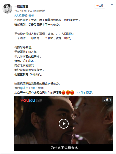 在圍觀精彩劇情的同時(shí),陳寶國(guó)、黃志忠、王慶祥、倪大紅、王勁松等一眾老戲骨的演技也令網(wǎng)友贊不絕口。尤其是王勁松飾演的“楊金水”一角,舉手投足間顯露的演技,也讓網(wǎng)友萬(wàn)萬(wàn)沒(méi)想到自己看了劇之后“竟然愛(ài)上了一位公公”。不少資深劇粉還專(zhuān)門(mén)為劇中的角色剪輯了相關(guān)“演技cut”,向廣大網(wǎng)友安利這部經(jīng)典歷史正劇。