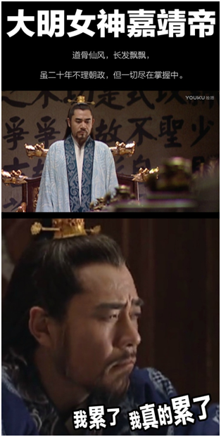為了吸引更多年輕用戶關(guān)注優(yōu)質(zhì)好劇,優(yōu)酷還通過(guò)各種有趣的“鬼畜”玩法,用年輕人的方式與網(wǎng)友一起重刷經(jīng)典。嚴(yán)肅與鬼畜形成了強(qiáng)烈的“反差萌”,拿優(yōu)酷發(fā)布的一系列有關(guān)《大明王朝1566》人物的趣味解讀來(lái)看,道骨仙風(fēng)、長(zhǎng)發(fā)飄飄的嘉靖帝成為了一代大明“女神”,而這位皇帝在劇中完全放飛了自我,上演了撒嬌賣(mài)萌,任性地用茅臺(tái)洗腳、上朝如廁的場(chǎng)景。別樣的畫(huà)風(fēng),讓網(wǎng)友紛紛感嘆“我可能追了一部假的歷史劇”。