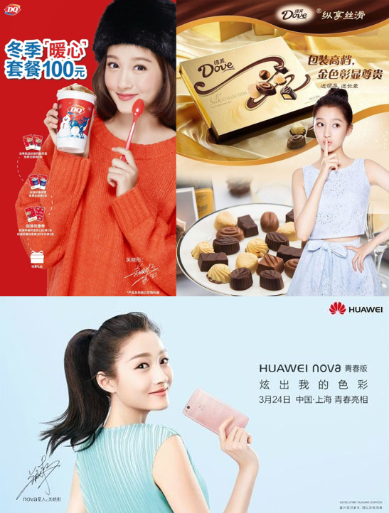 16年的《好先生》讓關曉彤打開了知名度,隨之而來的是越來越多一線品牌的合作邀約,先后代言DQ冰激凌、蘇菲、華為手機等品牌,并成為新一代德芙女孩。