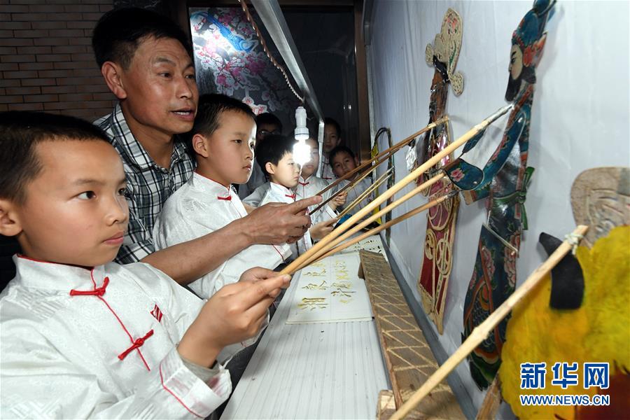 4月19日,萍鄉(xiāng)市湘東區(qū)東橋鎮(zhèn)界頭村農(nóng)民、湘東皮影戲第七代傳人丁永發(fā)(左二)與界頭小學(xué)學(xué)生一起演皮影戲。近年來,江西省非物質(zhì)文化遺產(chǎn)、萍鄉(xiāng)市湘東皮影戲在傳承中創(chuàng)新,當?shù)仄び皯騽F每年走村串巷下鄉(xiāng)演出近200場,并讓皮影戲走進學(xué)校,在小學(xué)生中普及這門傳統(tǒng)藝術(shù),深受百姓喜愛。新華社記者 宋振平 攝