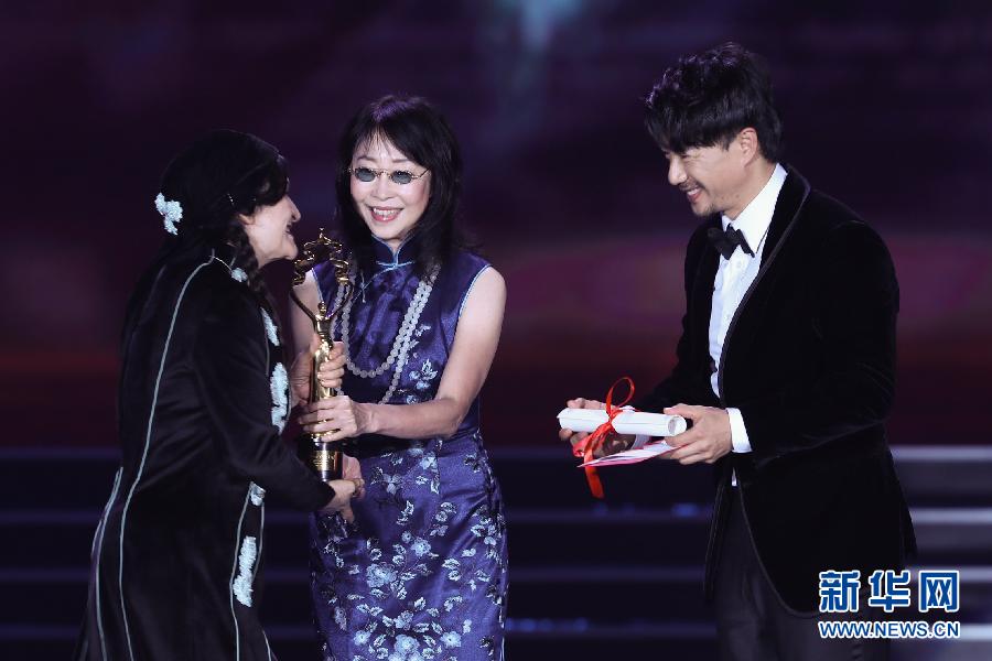 4月23日,頒獎嘉賓張婉婷(中)與段奕宏(右)為獲得“天壇獎最佳女主角獎”的影片《姐姐》的主演戈拉布·阿迪娜頒獎。當(dāng)日,在第七屆北京國際電影節(jié)頒獎典禮上,“天壇獎”各獎項逐一揭曉。 新華社發(fā)(李芳宇 攝)