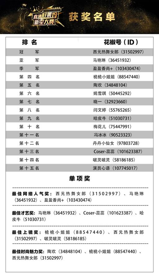 4月23日,由七星電影主辦的“直通好萊塢·新星大賽”活動,在經(jīng)過花椒小視頻報名、全國海選PK連麥初賽、復賽,以及線下終極對決賽之后,全國15強名單終于出爐,西元熱舞女郎(ID:31502997)、馬艷琳(ID:36451932)、盈盈香尚+(ID:103430474)3位佳麗分攬大賽冠、亞、季軍。“最佳網(wǎng)絡人氣獎”、“最佳上鏡獎”、“最佳才藝獎”和“最佳時尚魅力獎”也悉數(shù)花落人家。