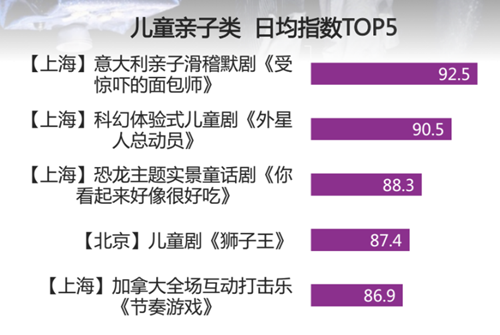 目前,兒童親子類日均指數(shù)TOP5中,意大利親子滑稽默劇《受驚嚇的面包師》和科幻體驗(yàn)式兒童劇《外星人總動員》在掛單溢價(jià)率均超過30%。其中意大利親子滑稽默劇《受驚嚇的面包師》以92.5奪得該月的指數(shù)冠軍,科幻體驗(yàn)式兒童劇《外星人總動員》以90.5位居第二,它們都以新奇有趣的表演形式受到了廣大兒童和家長們的喜愛。