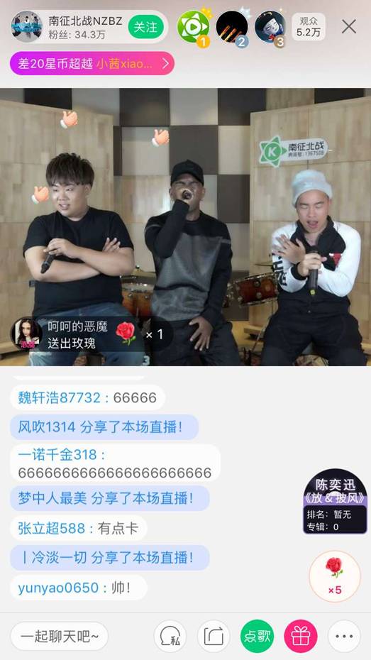 熟悉的旋律響起,南征北戰(zhàn)以一首《我的天空》霸氣開場,三子展現(xiàn)了rap速度極快且不帶一絲卡頓的現(xiàn)場版,粉絲頓時(shí)熱血沸騰。∮^看直播人數(shù)迅速上升到5.2萬,老鐵們狂刷禮物,果然大家都來觀看自己的青春了!