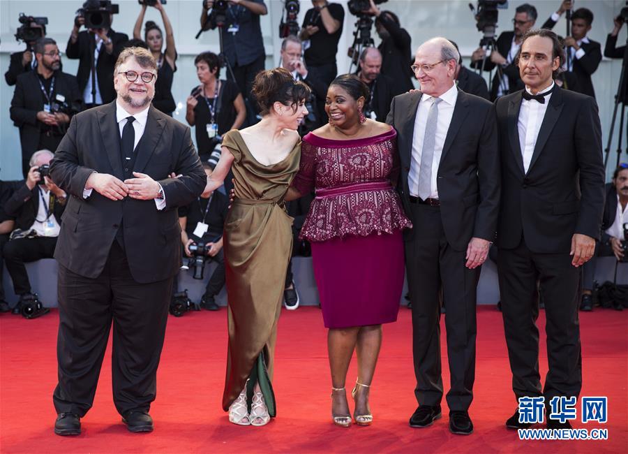 8月31日,在意大利威尼斯,第74屆威尼斯電影節(jié)主競賽單元影片《水形物語》劇組成員亮相首映式紅毯。 新華社記者金宇攝