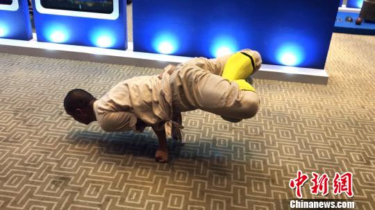 嵩山少林寺武僧團少年在現(xiàn)場展示祥龍擺尾、臥魚等功夫。 王子濤 攝