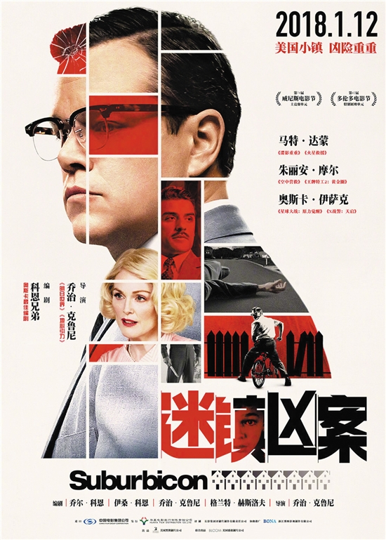 由科恩兄弟編劇,喬治·克魯尼導(dǎo)演的《迷鎮(zhèn)兇案》,匯集了馬特·達(dá)蒙、朱麗安·摩爾、奧斯卡·伊薩克等一眾明星。影片講述上世紀(jì)50年代,一場(chǎng)看似意外的兇殺案打破了一個(gè)家庭和小鎮(zhèn)的平靜,由此引發(fā)出一系列事件。影片曾入圍第74屆威尼斯電影節(jié)主競(jìng)賽單元、第42屆多倫多電影節(jié)特別展映單元,劇本有明顯的科恩兄弟風(fēng)格,黑色幽默和重重懸念頗受好評(píng)。