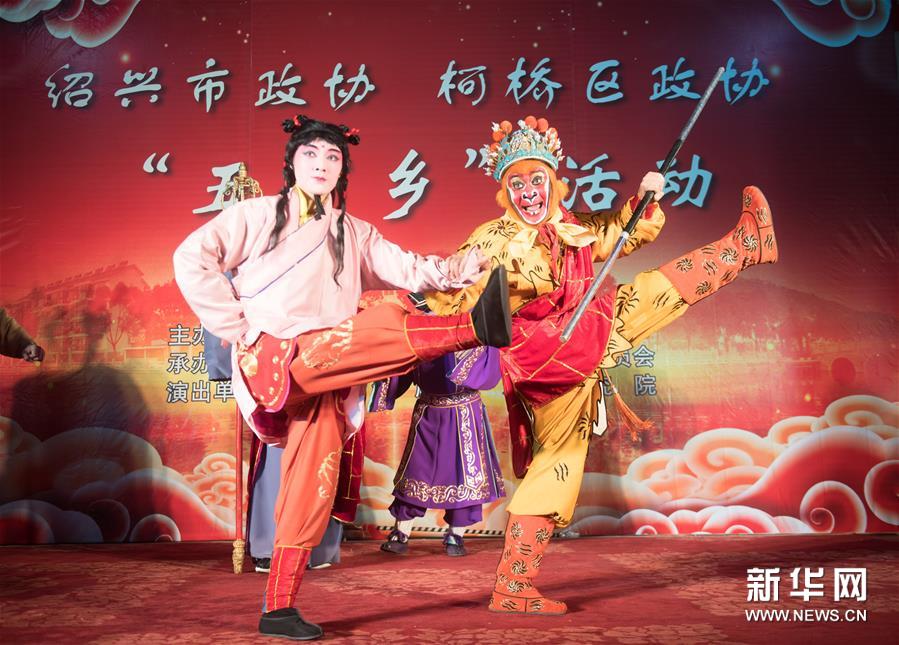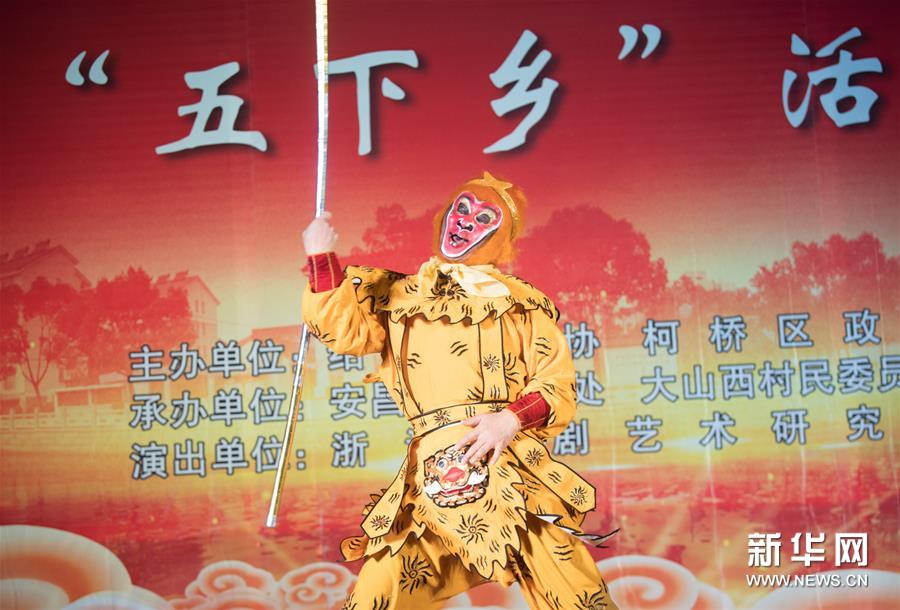 在浙江省紹興市柯橋區(qū)安昌鎮(zhèn)大山西村文化禮堂,國家級非遺傳承人劉建楊為村民表演紹劇《孫悟空大戰(zhàn)紅孩兒》。紹劇,是我國亂彈戲劇傳存在紹興的一支,生旦凈丑,文武兼?zhèn),唱腔高亢激越,動人心魄?008年被列入第二批國家級非物質(zhì)文化遺產(chǎn)名錄。經(jīng)過近400年發(fā)展,紹劇擁有400多個劇目,其中又以猴戲最為出名。二十世紀(jì)40年代,紹劇表演藝術(shù)家六齡童、七齡童編演36本《西游記》,開創(chuàng)紹劇猴戲。紹劇猴戲融入北派猴戲的神性和南派猴戲的猴性,經(jīng)典劇目《孫悟空三打白骨精》《火焰山》歷經(jīng)半個多世紀(jì),演員已五代易人,久演不衰。浙江紹劇藝術(shù)研究院承擔(dān)著紹劇非遺保護、研究和傳承發(fā)展的任務(wù),紹劇猴戲在此傳承有序、不斷發(fā)展。近年來,紹劇院形成了以“江南猴王”劉建楊為核心的猴戲團隊,每年演出全本和折子戲近百場。新華社記者翁忻旸攝 -