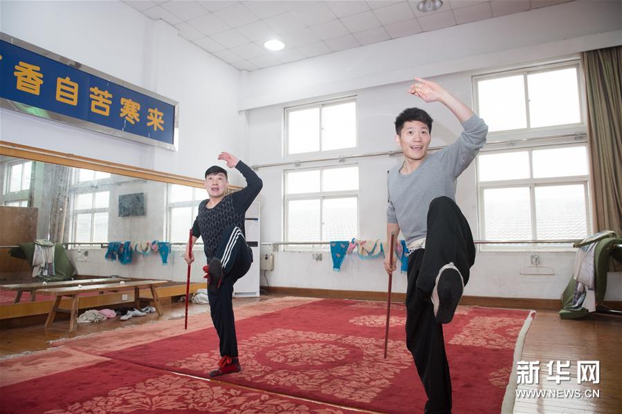 在浙江省紹興市越城區(qū)浙江紹劇藝術(shù)研究院,國家級非遺傳承人劉建楊(前)帶領(lǐng)徒弟張君練習(xí)猴戲基本功。紹劇,是我國亂彈戲劇傳存在紹興的一支,生旦凈丑,文武兼?zhèn),唱腔高亢激越,動人心魄?008年被列入第二批國家級非物質(zhì)文化遺產(chǎn)名錄。經(jīng)過近400年發(fā)展,紹劇擁有400多個劇目,其中又以猴戲最為出名。二十世紀(jì)40年代,紹劇表演藝術(shù)家六齡童、七齡童編演36本《西游記》,開創(chuàng)紹劇猴戲。紹劇猴戲融入北派猴戲的神性和南派猴戲的猴性,經(jīng)典劇目《孫悟空三打白骨精》《火焰山》歷經(jīng)半個多世紀(jì),演員已五代易人,久演不衰。浙江紹劇藝術(shù)研究院承擔(dān)著紹劇非遺保護、研究和傳承發(fā)展的任務(wù),紹劇猴戲在此傳承有序、不斷發(fā)展。近年來,紹劇院形成了以“江南猴王”劉建楊為核心的猴戲團隊,每年演出全本和折子戲近百場。新華社記者 翁忻旸 攝 -