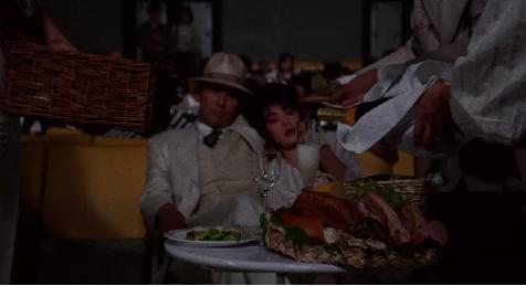 影片的開頭就極具黑色荒誕喜劇的意味,一個身穿白衣服的男人帶著女友,在電影院里看電影,直面鏡頭說著自己最討厭看電影的時候被打擾。但在他前面卻擺著一張折疊桌子,上面有色彩繽紛的西式腌火腿、色拉,冰桶里還有香檳酒。之后真的有人吃洋芋片和擠包裝袋,發(fā)出噪音,畫面極具諷刺意味。