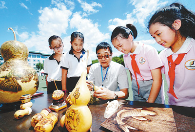6月28日,孩子們在非遺傳承人徐建利帶領(lǐng)下領(lǐng)略烙畫之美。當(dāng)日,“2018京津冀非遺進(jìn)校園交流會(huì)暨北京海淀區(qū)非遺進(jìn)校園成果展”在北京第二十中學(xué)舉辦,來自京津冀三地的40多位非遺傳承人帶著自己的作品與師生們進(jìn)行面對面交流,學(xué)生還可以體驗(yàn)非遺產(chǎn)品的制作。
