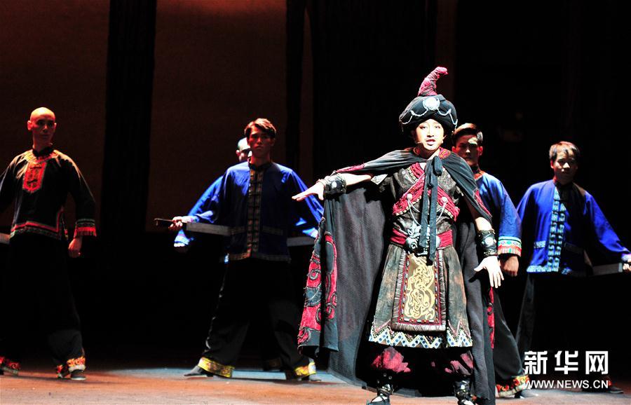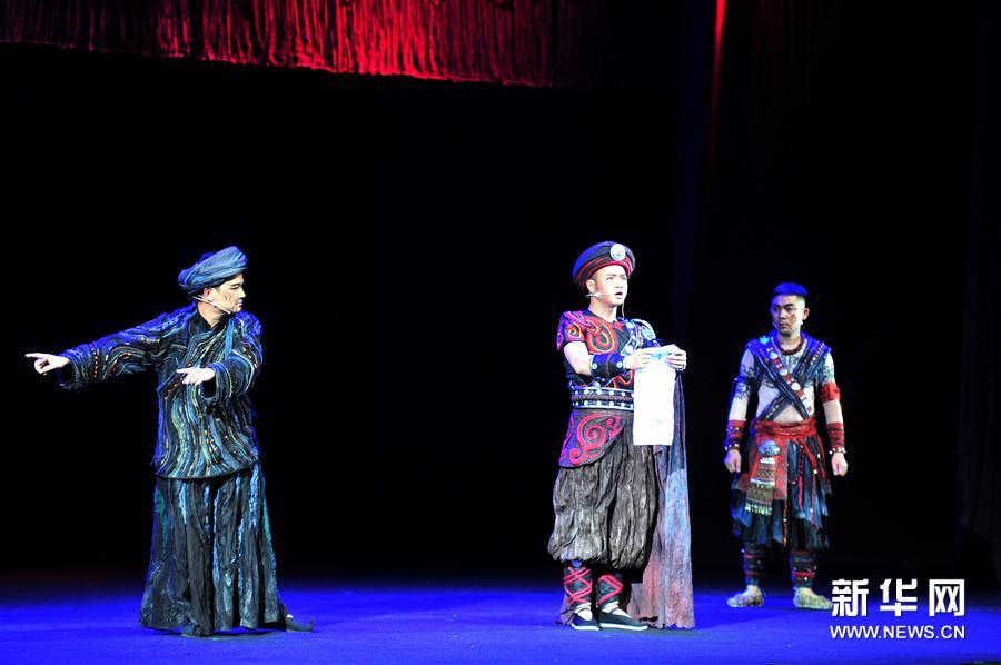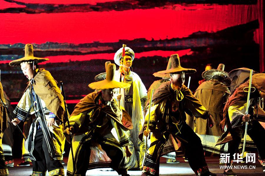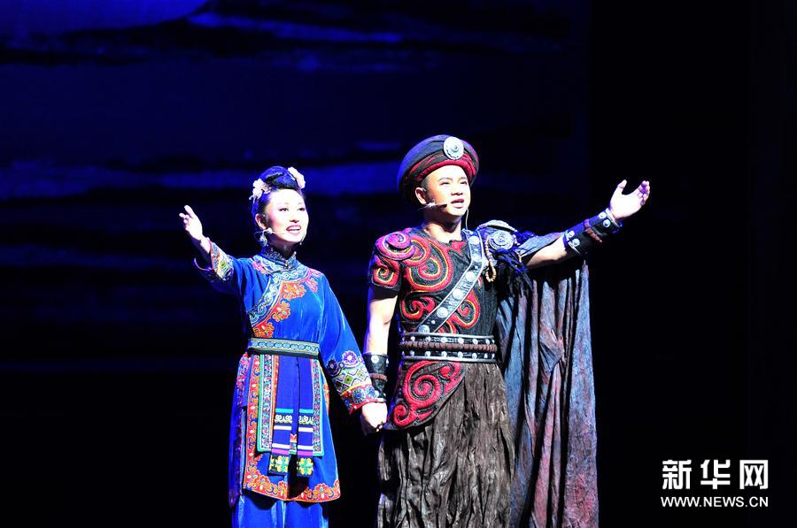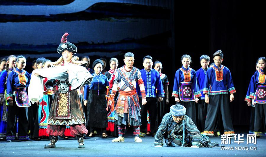 9月10日,演員在原創(chuàng)彝族歌劇《天穹的歌謠》中表演。當(dāng)日,原創(chuàng)彝族歌劇《天穹的歌謠》在貴州省國(guó)際會(huì)議中心劇場(chǎng)上演。該劇以悲美愛(ài)情故事為主線,表現(xiàn)了彝族兒女疾惡向善、不吝犧牲、仁慈寬厚的高尚情懷,將多姿多彩的彝族文化以歌劇形式呈現(xiàn)。新華社記者 陶亮 攝
