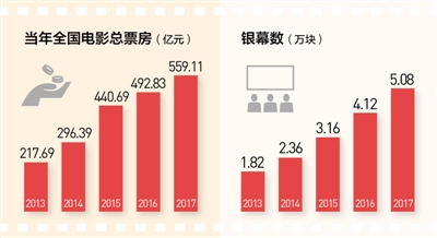 2018年春節(jié)長假期間,全國電影票房創(chuàng)下歷史同期新高,除夕至正月初六,全國總票房達(dá)57.2億元,較去年同期增長66.9%。2017年全國電影總票房達(dá)559.11億元,較上年同期增長13.45%。