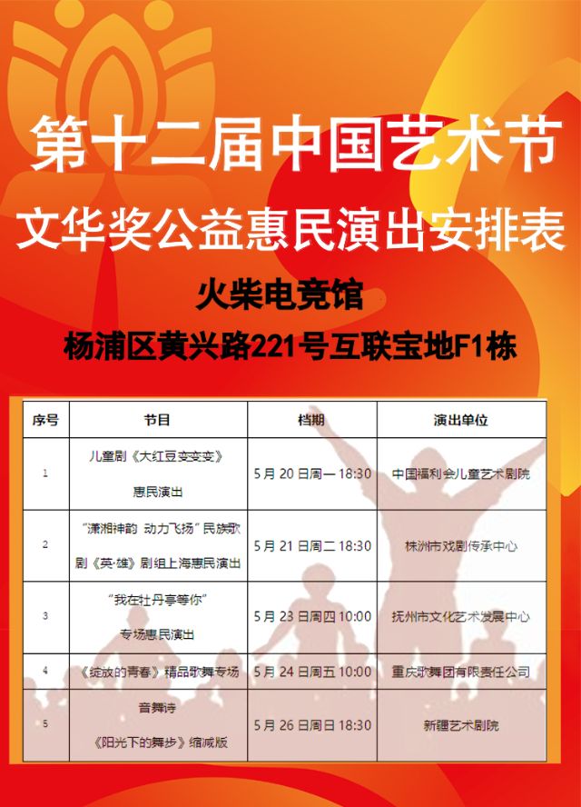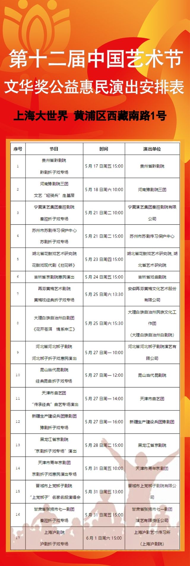 本次文華獎(jiǎng)惠民演出將于5月17日至6月1日期間,在上海大世界、中山公園、火柴電競(jìng)館三個(gè)場(chǎng)地上演34場(chǎng)。為方便廣大觀眾積極參與,此次文華獎(jiǎng)惠民演出活動(dòng)的參與方式為線(xiàn)上免費(fèi)預(yù)約,觀眾可于即日起在十二藝節(jié)官網(wǎng)(www.the12caf.cn)或于5月8日起登錄大麥網(wǎng)十二藝節(jié)購(gòu)票專(zhuān)題頁(yè)關(guān)注劇目演出信息并完成線(xiàn)上演出預(yù)約。預(yù)約中山公園及火柴電競(jìng)館演出的觀眾可于當(dāng)天直接憑二維碼掃碼入場(chǎng),預(yù)約大世界演出的觀眾須憑短信在大世界3號(hào)入口領(lǐng)票入場(chǎng)。