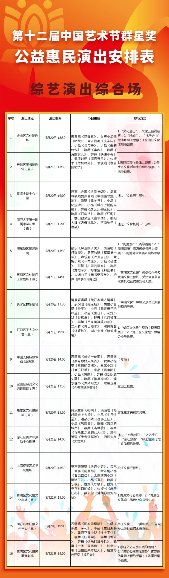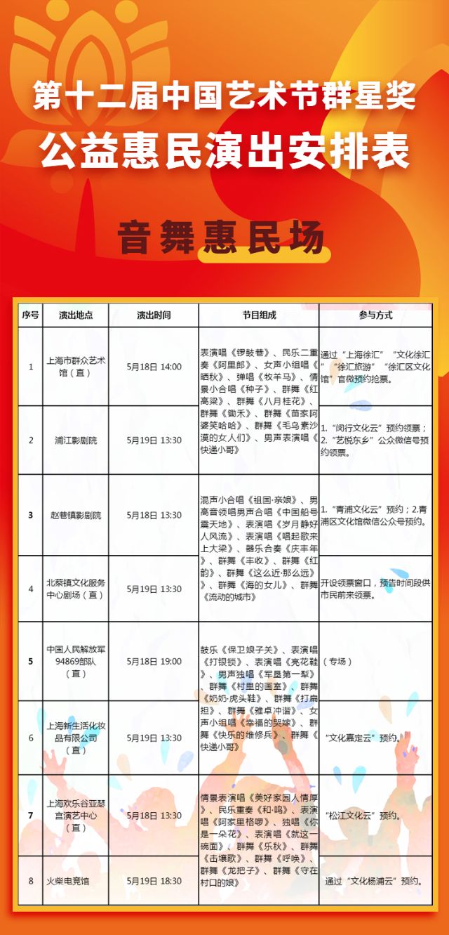 群星獎(jiǎng)惠民演出將于群星獎(jiǎng)評(píng)比期間5月18日至21日深入16個(gè)區(qū),舉行24場(chǎng)惠民演出。84個(gè)決賽參演團(tuán)隊(duì),連續(xù)四天,走進(jìn)企業(yè)、社區(qū)、部隊(duì)、學(xué)校、旅游景點(diǎn),盡可能滿(mǎn)足更多觀眾的觀摩需求,將群星獎(jiǎng)成果與不同人群分享。本次惠民演出由16個(gè)區(qū)參與承接運(yùn)營(yíng),除個(gè)別部隊(duì)專(zhuān)場(chǎng)不對(duì)外開(kāi)放預(yù)約外,其余場(chǎng)次各區(qū)居民皆可通過(guò)各區(qū)相關(guān)微信公眾號(hào)或文化云進(jìn)行預(yù)約,具體預(yù)約時(shí)間請(qǐng)關(guān)注相關(guān)公眾號(hào)或文化云。與此同時(shí),群星獎(jiǎng)還有13場(chǎng)惠民演出通過(guò)國(guó)家文化云和文化上海云進(jìn)行現(xiàn)場(chǎng)直播(表格中標(biāo)注“直”),讓全國(guó)更多觀眾共享群星盛事。