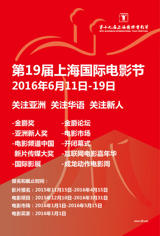 第19屆上海國際電影節(jié)將在2016年6月11日-19日舉行。凡在2015年6月1日以后制作完成且符合相關(guān)條件的長片(劇情片、動(dòng)畫片、紀(jì)錄片)可報(bào)名參加比賽。1月1日以后制作完成且符合相關(guān)條件的長片可報(bào)名參加展映。