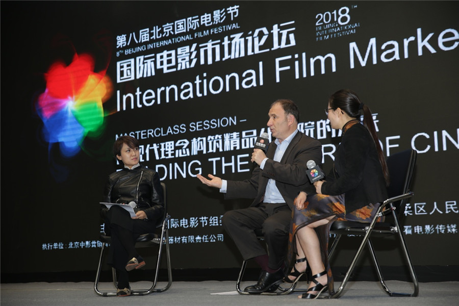法國(guó)UGC院線公司歐洲前董事總經(jīng)理、法國(guó)Ymagis公司前首席執(zhí)行官讓-瑪麗·杜拉(中)與《看電影》國(guó)際部總監(jiān)楊瑩(左)