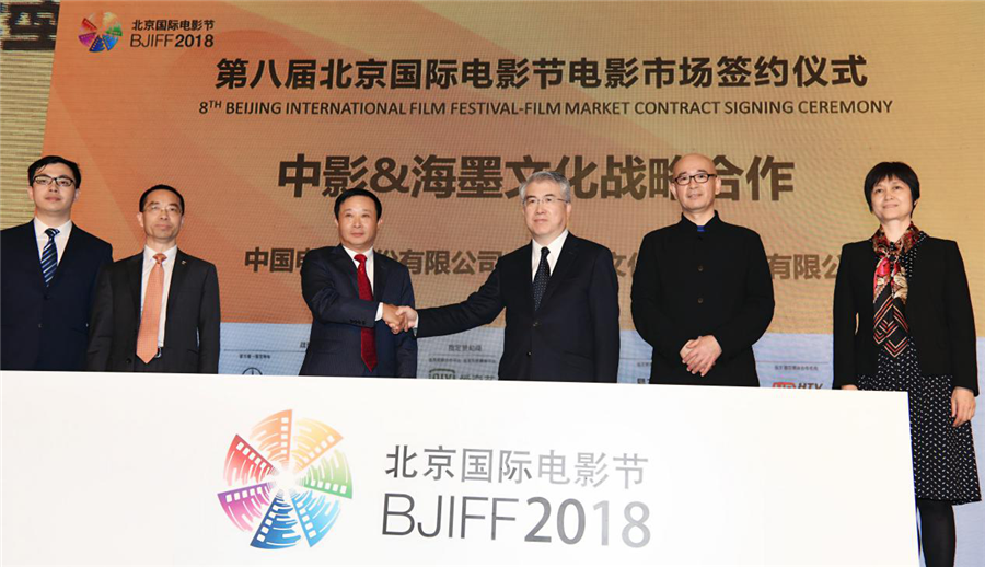 4月20日,在第八屆北京國際電影節(jié)上中影股份集團董事長喇培康與中國泛海集團副總裁、海墨文化董事長楊科正式簽署戰(zhàn)略合作協(xié)議。中影股份集團總裁江平、中國泛海集團執(zhí)行副總裁余政、中影股份副總經(jīng)理趙海城、財務總監(jiān)顧勤陪同參加了此次簽約。自此中國電影股份有限公司與海墨文化傳媒股份有限公司戰(zhàn)略合作伙伴關系正式達成。雙方將在影視項目的開發(fā)、制片、制作、推廣及營銷等全方位展開合作;在影院的建設與運營環(huán)節(jié)密切配合;在項目招商層面展開深度合作,并進一步探索研究、拓展版權(quán)售授的新業(yè)態(tài)。