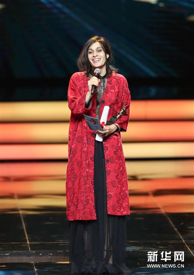 6月23日,跨國合拍片《呼吸之間》女主角莎樂美·戴繆莉亞在臺上領(lǐng)獎。新華社記者 丁汀 攝