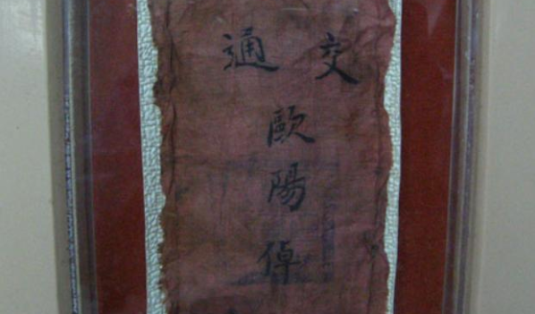 在井岡山革命博物館的展室里陳列著一份不同尋常的紅色交通證。這份交通證用紅綢布制作,長:12cm,寬:7.5cm,證件上寫有“交通歐陽倬”五字。