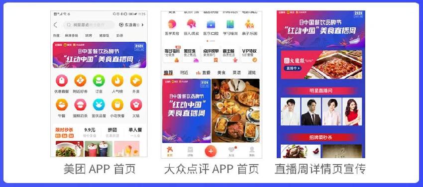 美團(tuán) 作為國內(nèi)影響力較大的的生活服務(wù)類平臺(tái),服務(wù)宣傳宗旨“吃喝玩樂全都有”,除了為“紅動(dòng)中國”美食直播周 提供美團(tuán)APP、大眾點(diǎn)評(píng)APP等首頁廣告資源位置、給予直播間定向流量支持以外,還將全程為直播周提供直播運(yùn)營和技術(shù)支持。