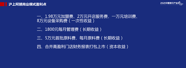 滬上阿姨的商業(yè)模式盈利點主要有四個,其中,1.98萬元的加盟費、2萬元開店服務費、1萬元培訓費、8萬元設備采購費,是一次性收益。每月1800元的管理費用,是長期收益。5萬元的首批原原料費,每月原料費,也是長期收益。合并高盈利門店財務報表打包上市,這是資本收益。它就是靠這些來賺錢的。