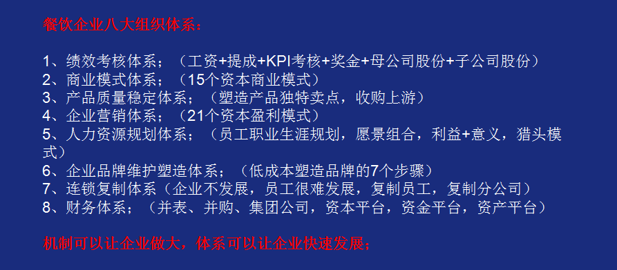 未來,餐飲企業(yè)要高利潤成長,要把八大系統(tǒng)做好,績效考核系統(tǒng)、商業(yè)模式系統(tǒng)、產品質量穩(wěn)定系統(tǒng)、企業(yè)營銷系統(tǒng)、人力資源規(guī)劃系統(tǒng)、企業(yè)品牌維護塑造系統(tǒng)、連鎖復制系統(tǒng)、財務系統(tǒng)。