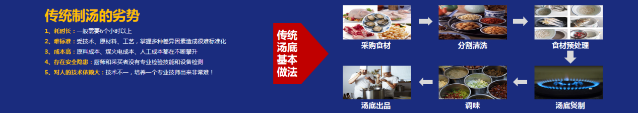湯的標準化很關(guān)鍵。傳統(tǒng)熬湯存在很大劣勢,首先制作成本高,包括人工成本、原料成本;還有就是食品安全問題……